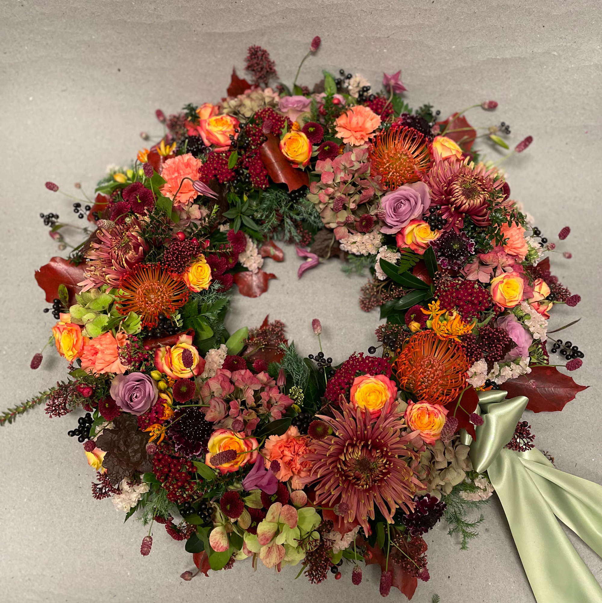 Begravelseskranse gives ofte af nære familiemedlemmer, hvor den cirkulære form på kransen symboliserer evighed. I webshoppen her finder du et bredt udvalg af blomsterkranse.